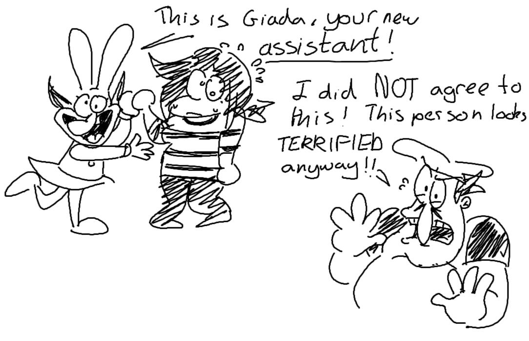 ok so the lore is giada is good friends with noisette (not exactly sure how that happened yet) and noisette convinces giada to work for peppino in the pizzeria because she thinks he gets lonely and and bored in there all day (he does)peppino is reluctant at first but noisette is noisette and wont take no for an answer so he decides sure whatever why not. he cant actually afford to pay them but giada doesnt mind, theyre fine just helping out
